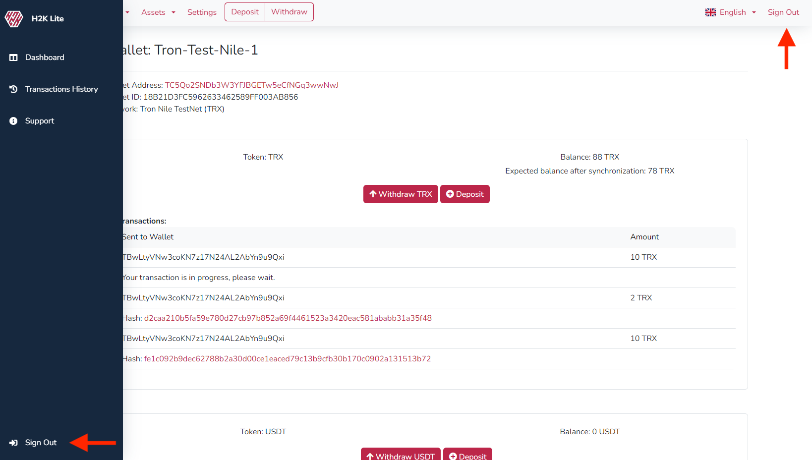 The option to log out is also available on the main page through the «Dashboard» section which can be expanded.