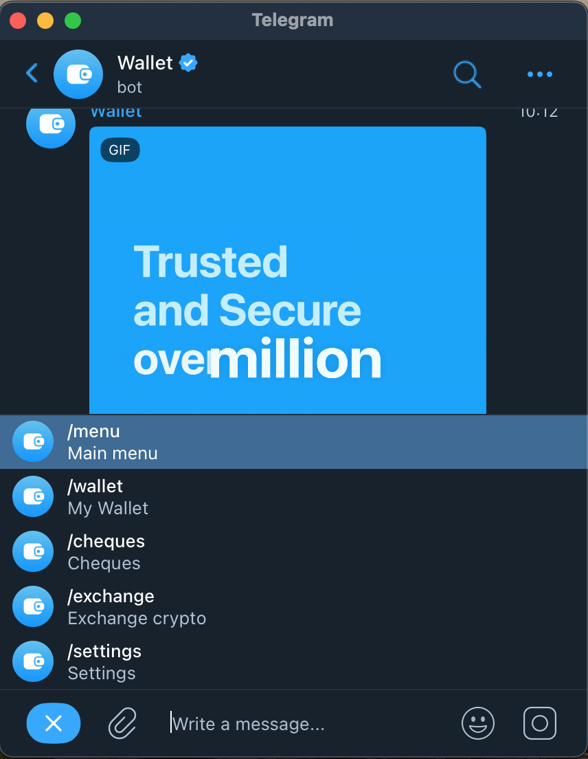6. Для перехода к функционалу кошелька откройте раздел «Меню» или нажмите на «Кошелек» у поля для ввода сообщения. С помощью данного кошелька вы можете покупать, отправлять и обменивать криптоактивы.