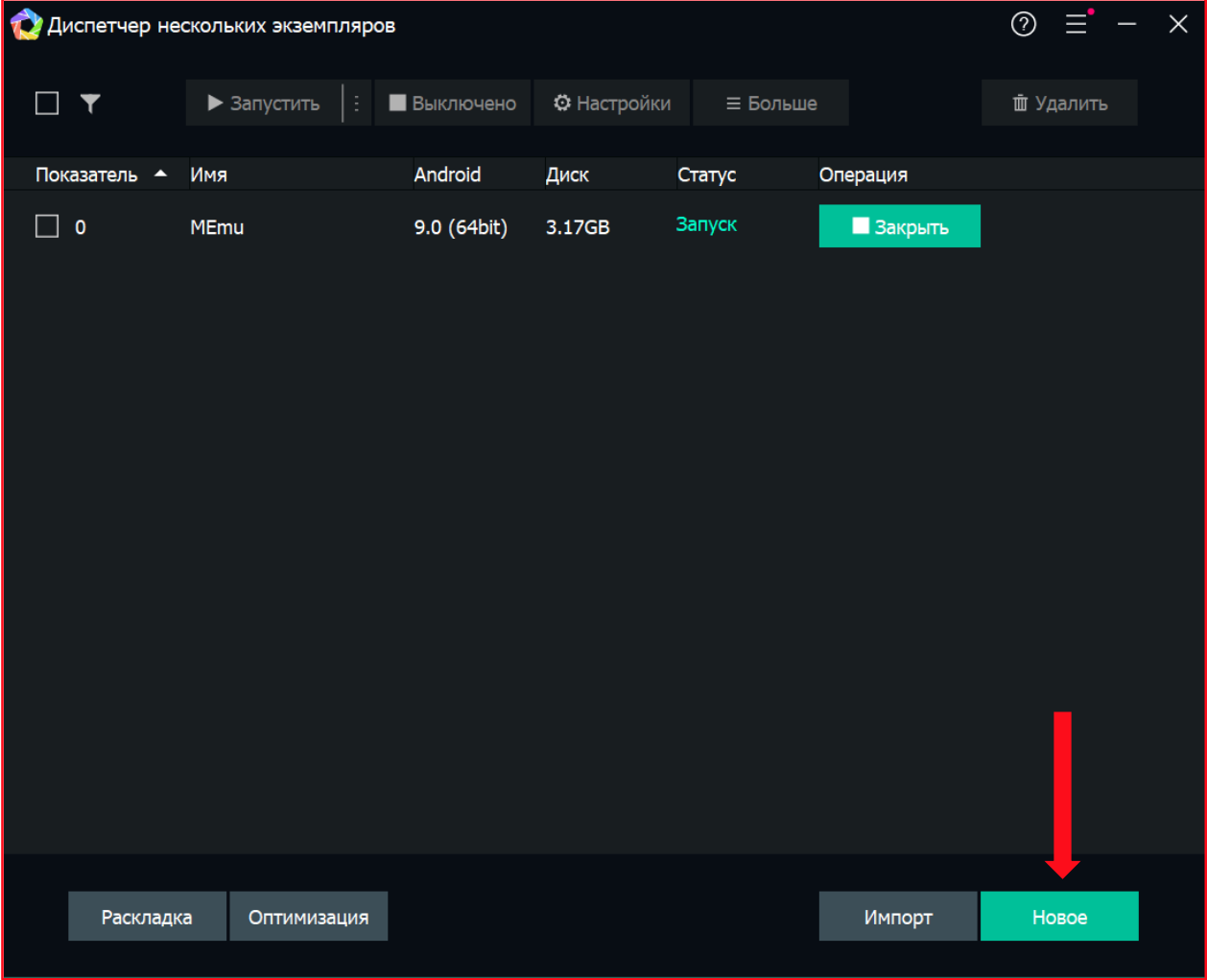 3. Зайти в настройки эмулятора и нажать на кнопку «Новое»