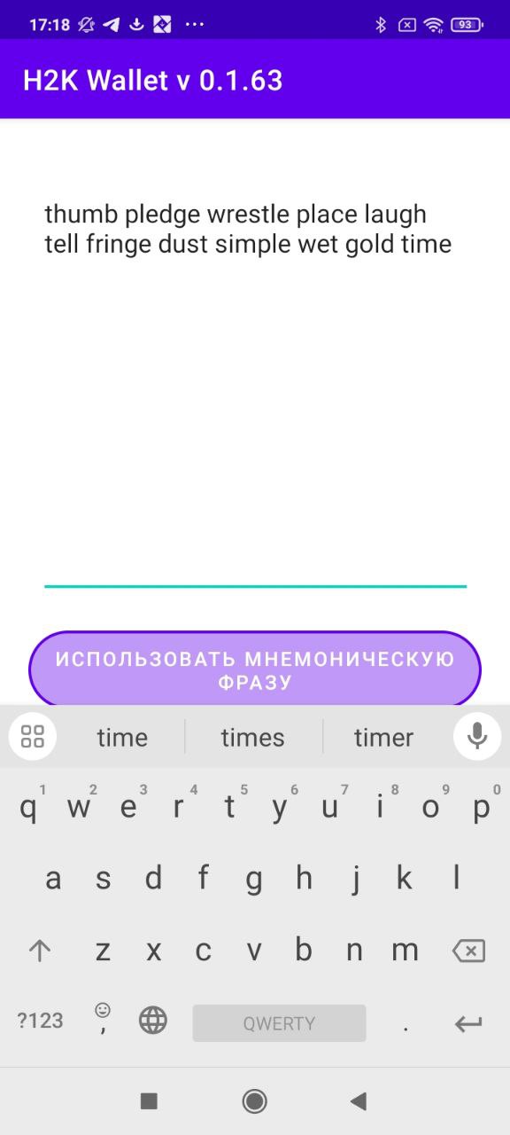 5. Введите мнемоническую фразу в поле: скопируйте и вставьте в это поле или введите вручную 12 слов через пробелы как показано ниже. После нажмите «Использовать мнемоническую фразу».