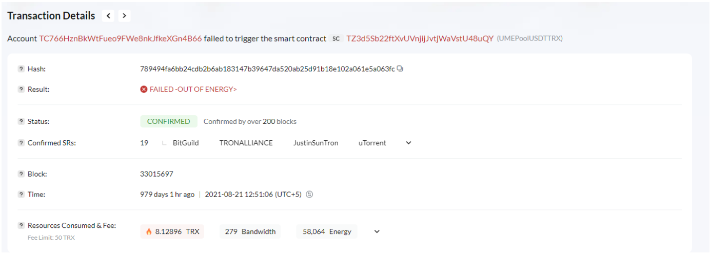 В поле Resources Consumed & Fee видно, что блокчейн взял 0.282 TRX комиссии за перевод.