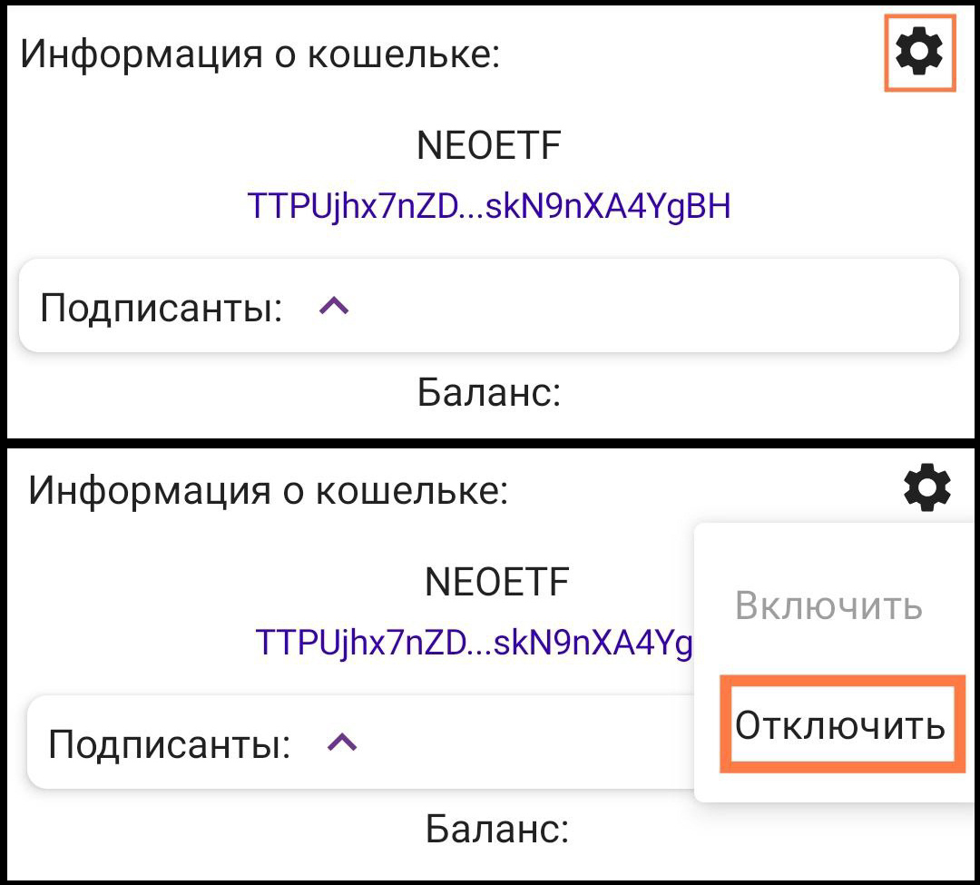 - Чтобы кошелек отразился снова в общем списке, нажмите на иконку шестеренки и выберите «Включить».